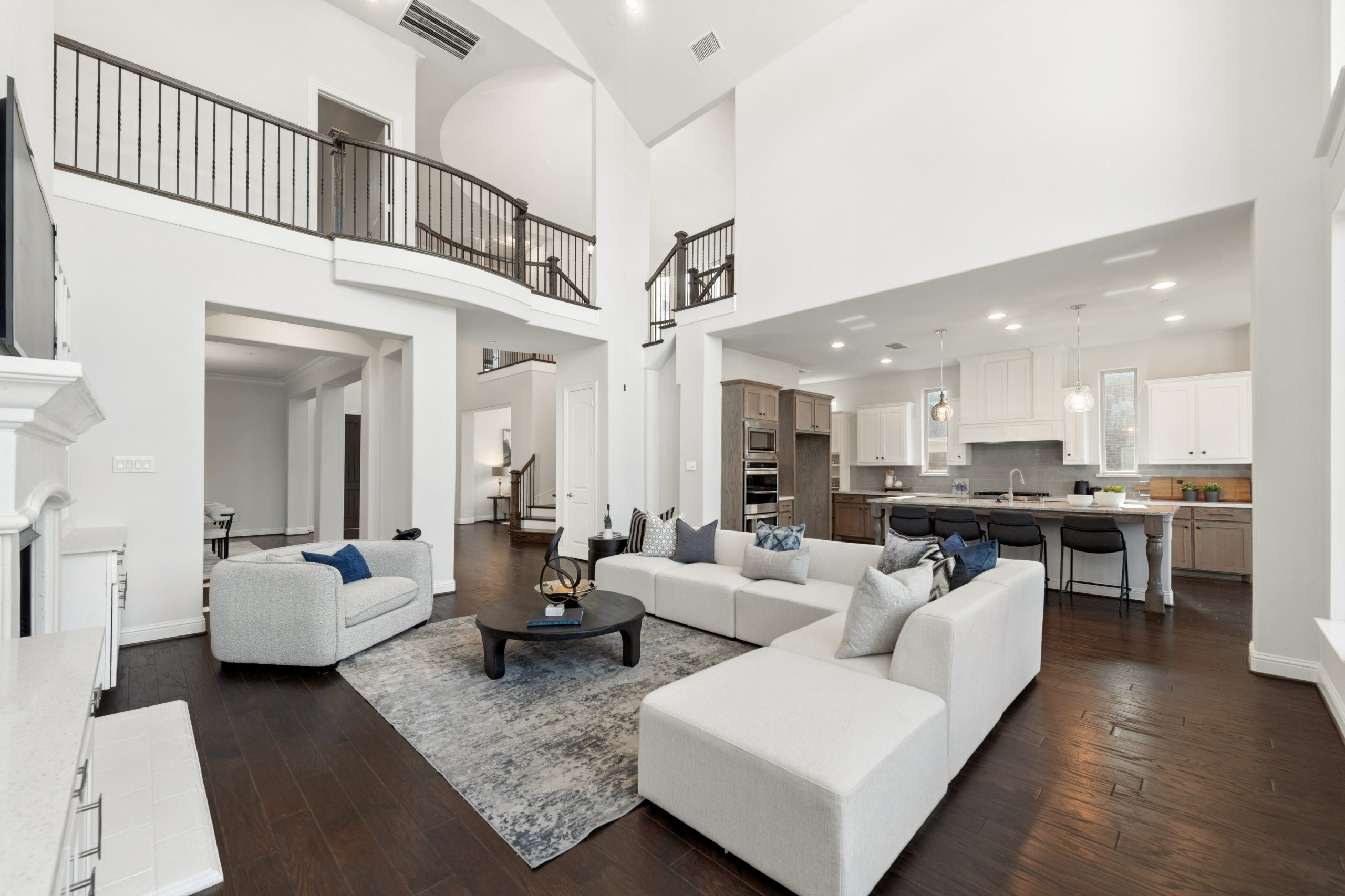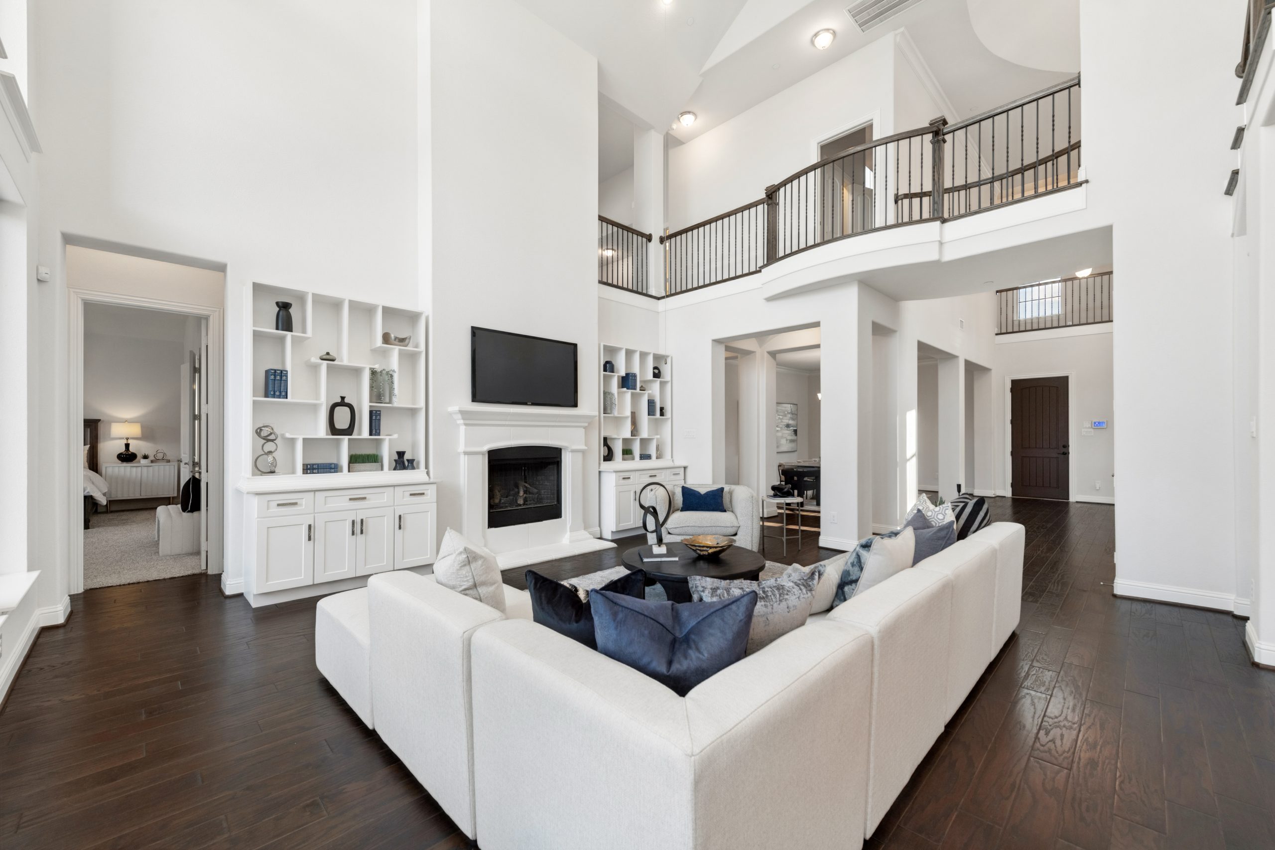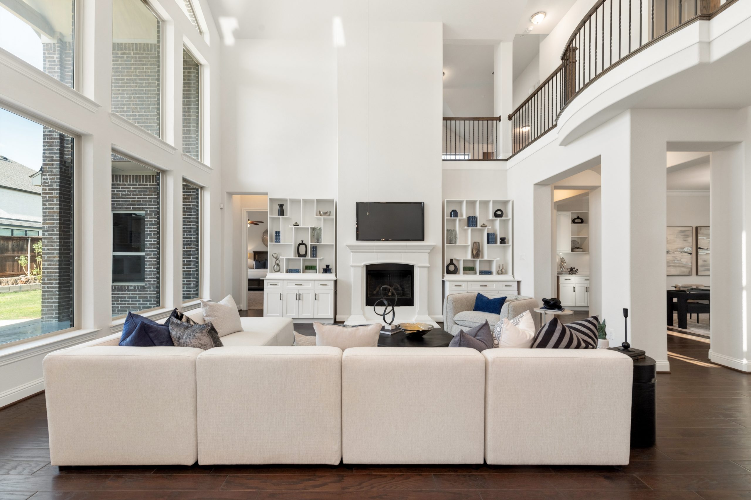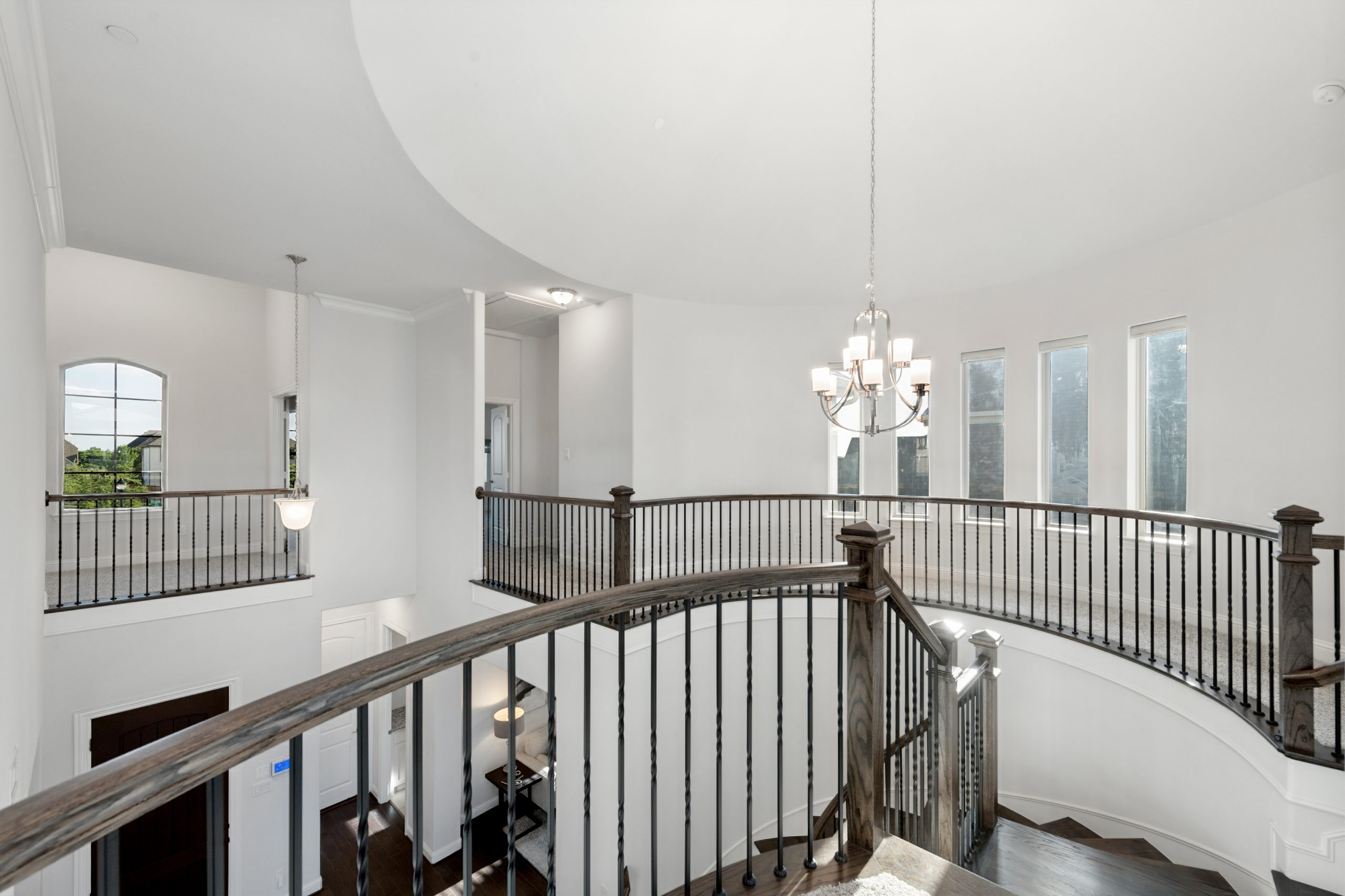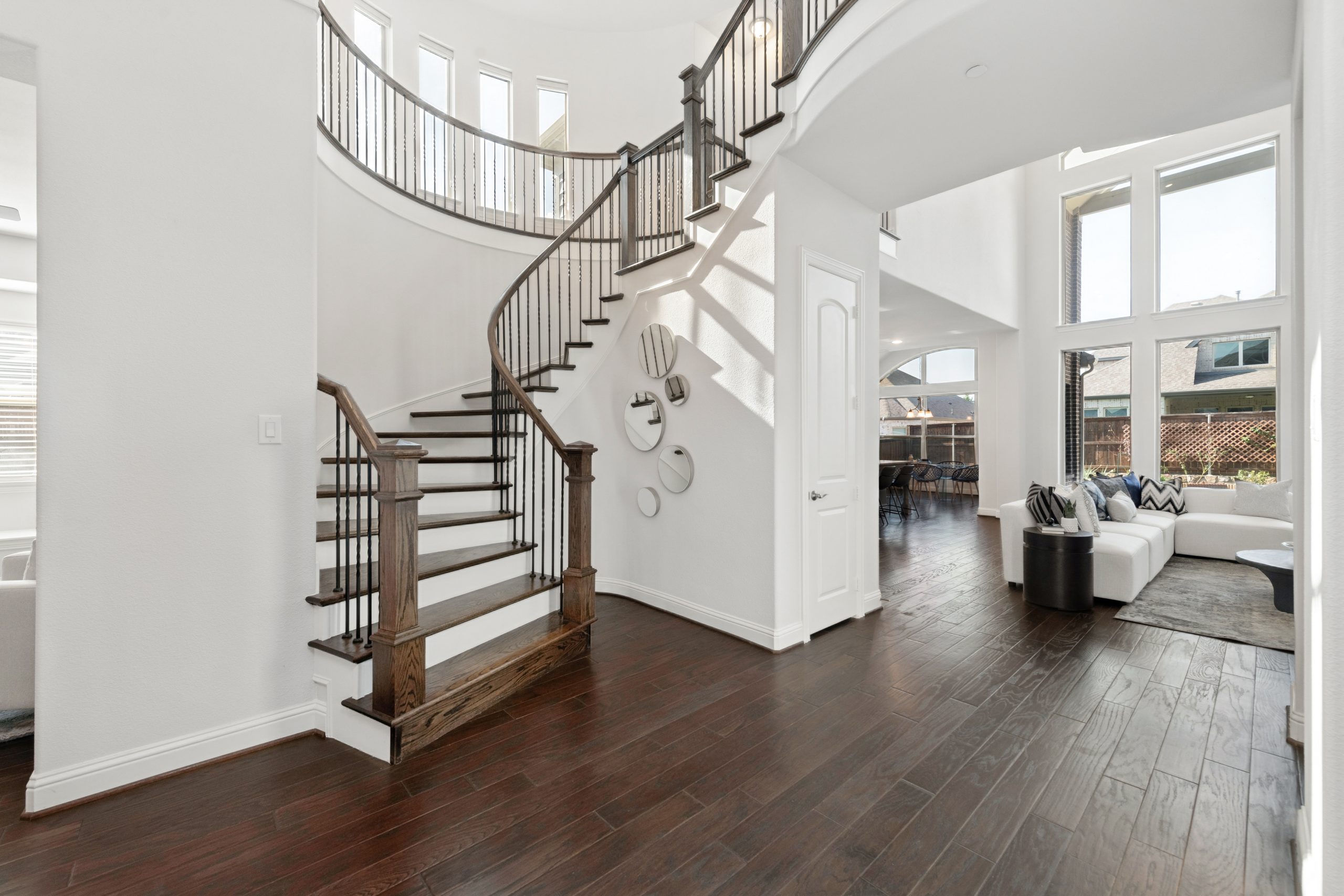 - Grand two-story entry and curved staircase greet with light-filled spaces.