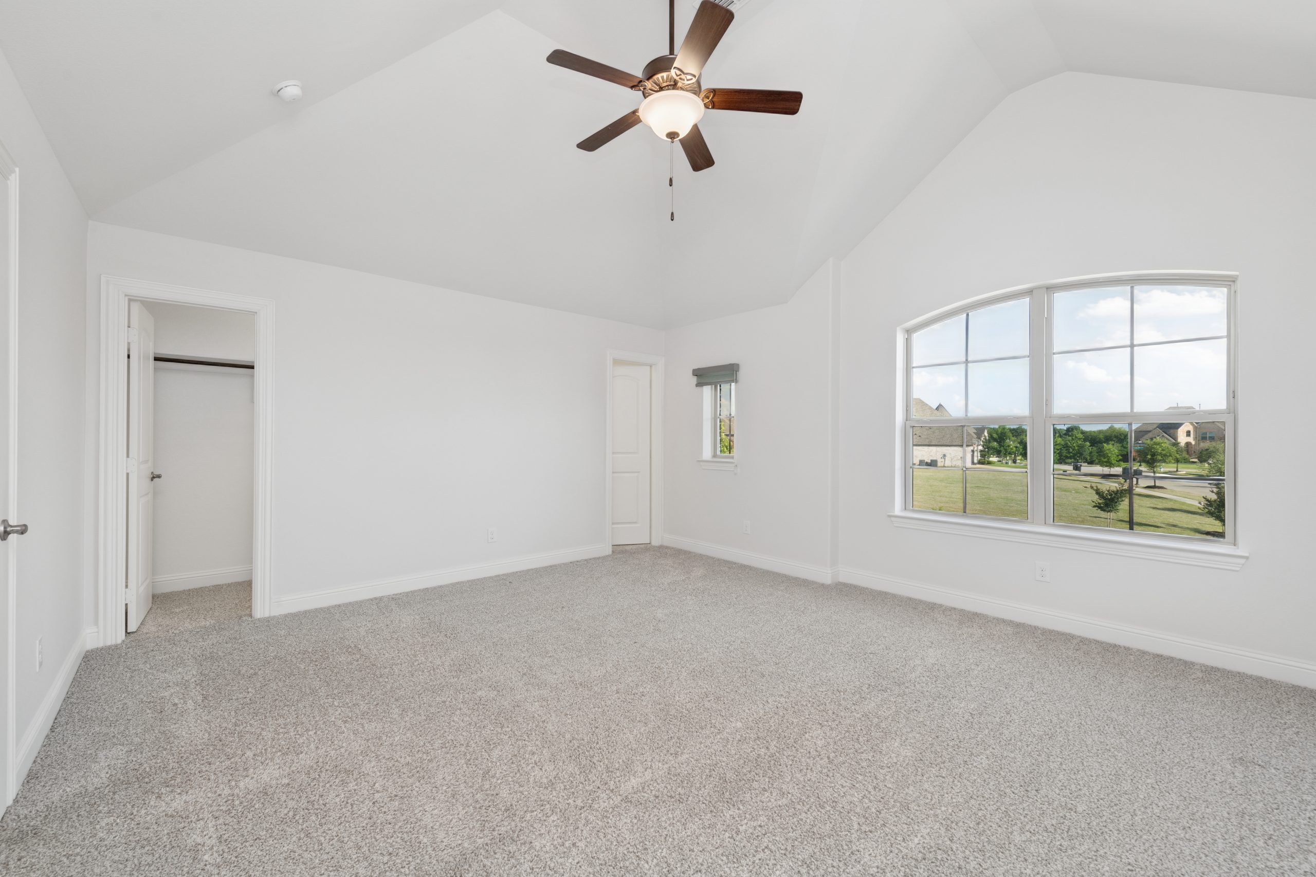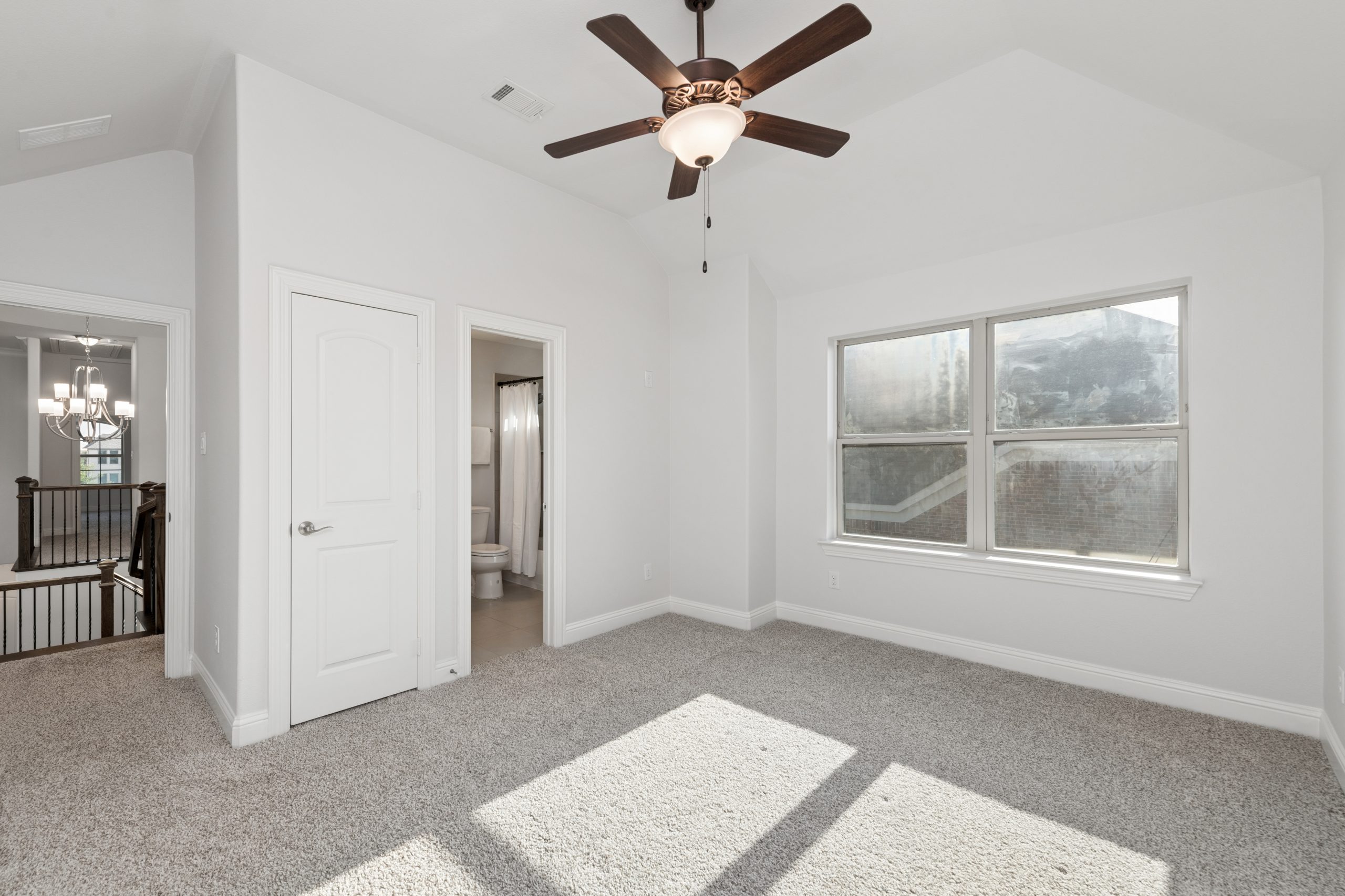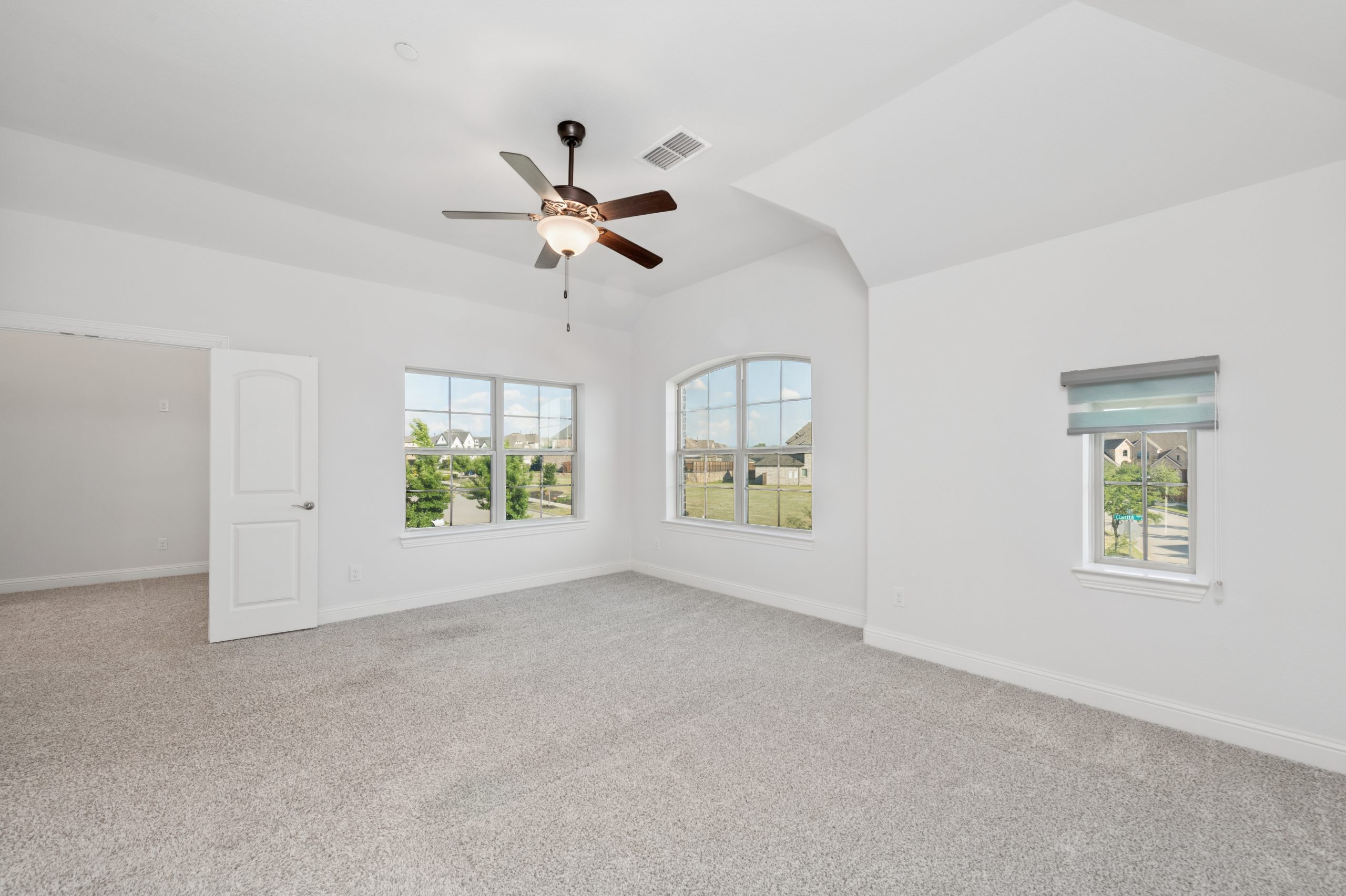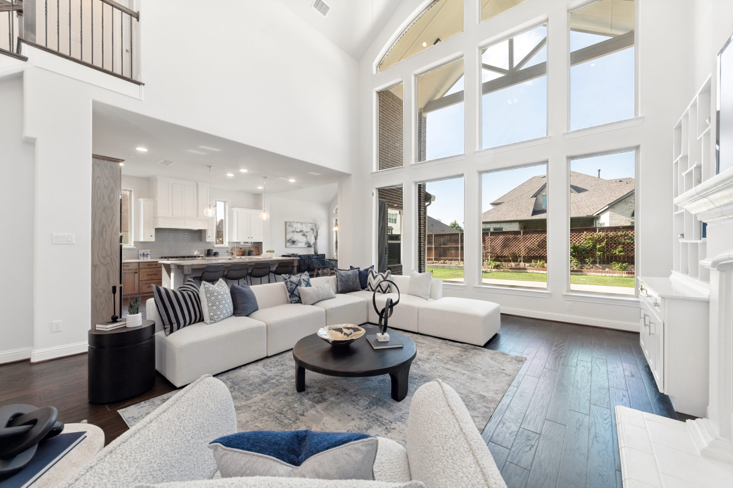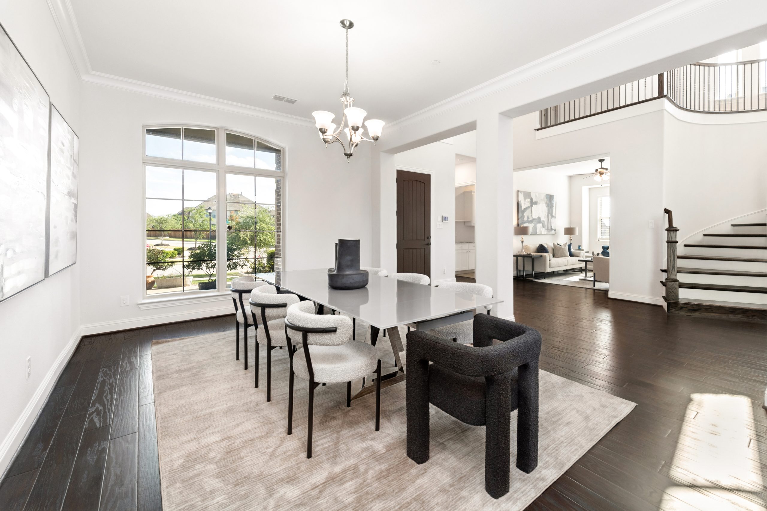 - Grand two-story entry and curved staircase greet with light-filled spaces.