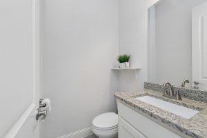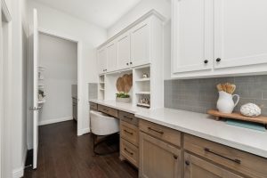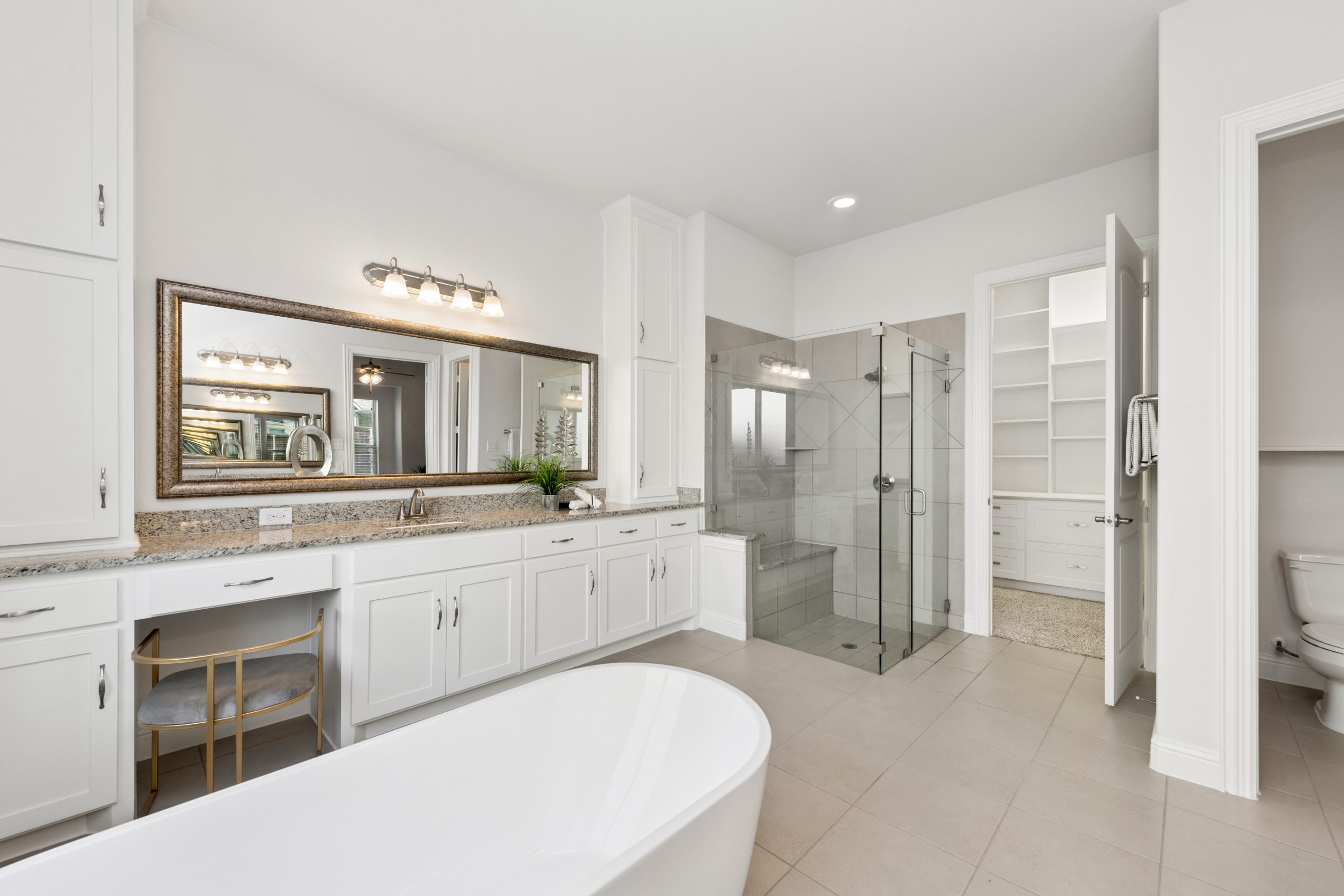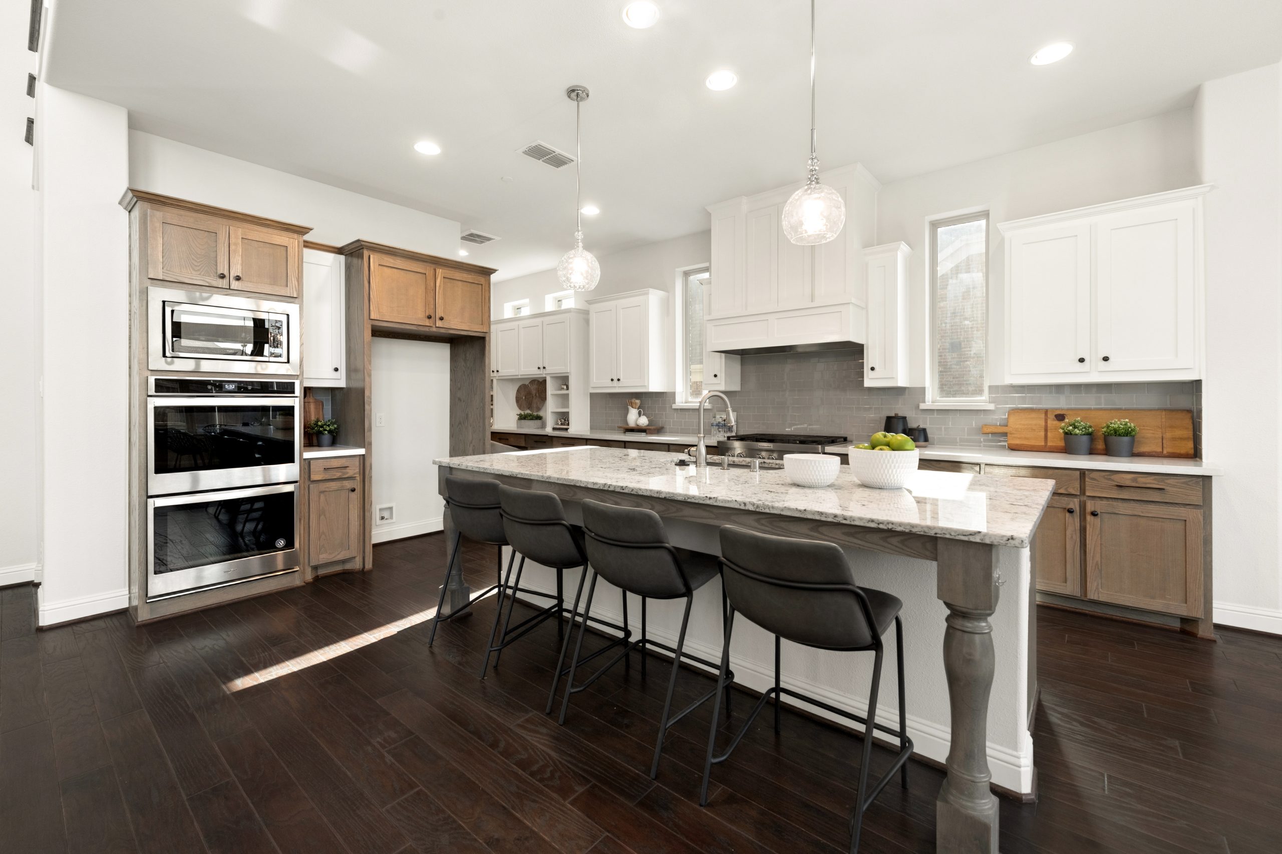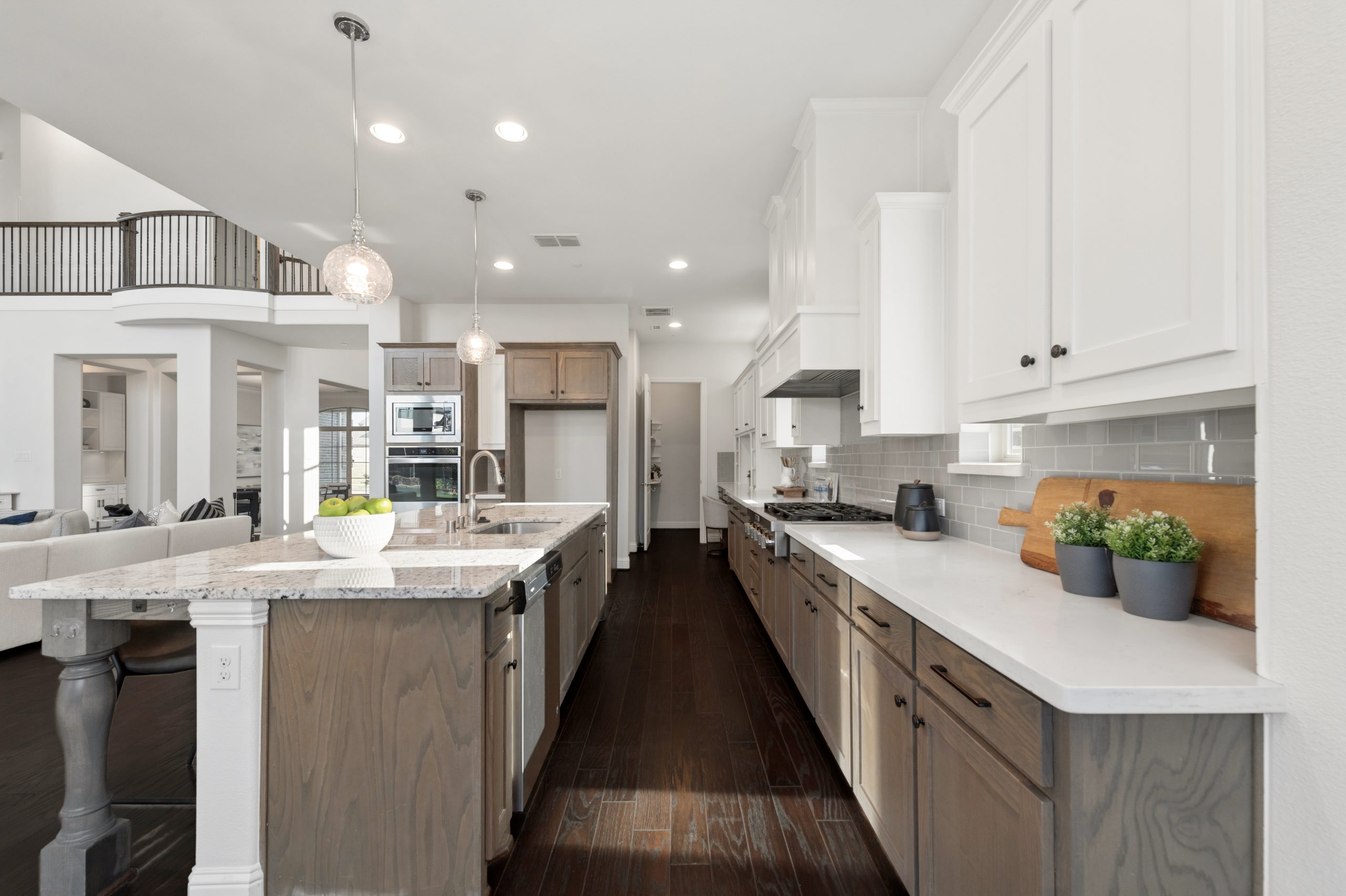 - Chef’s kitchen features large island, gas cooktop, double ovens, walk-in pantry.