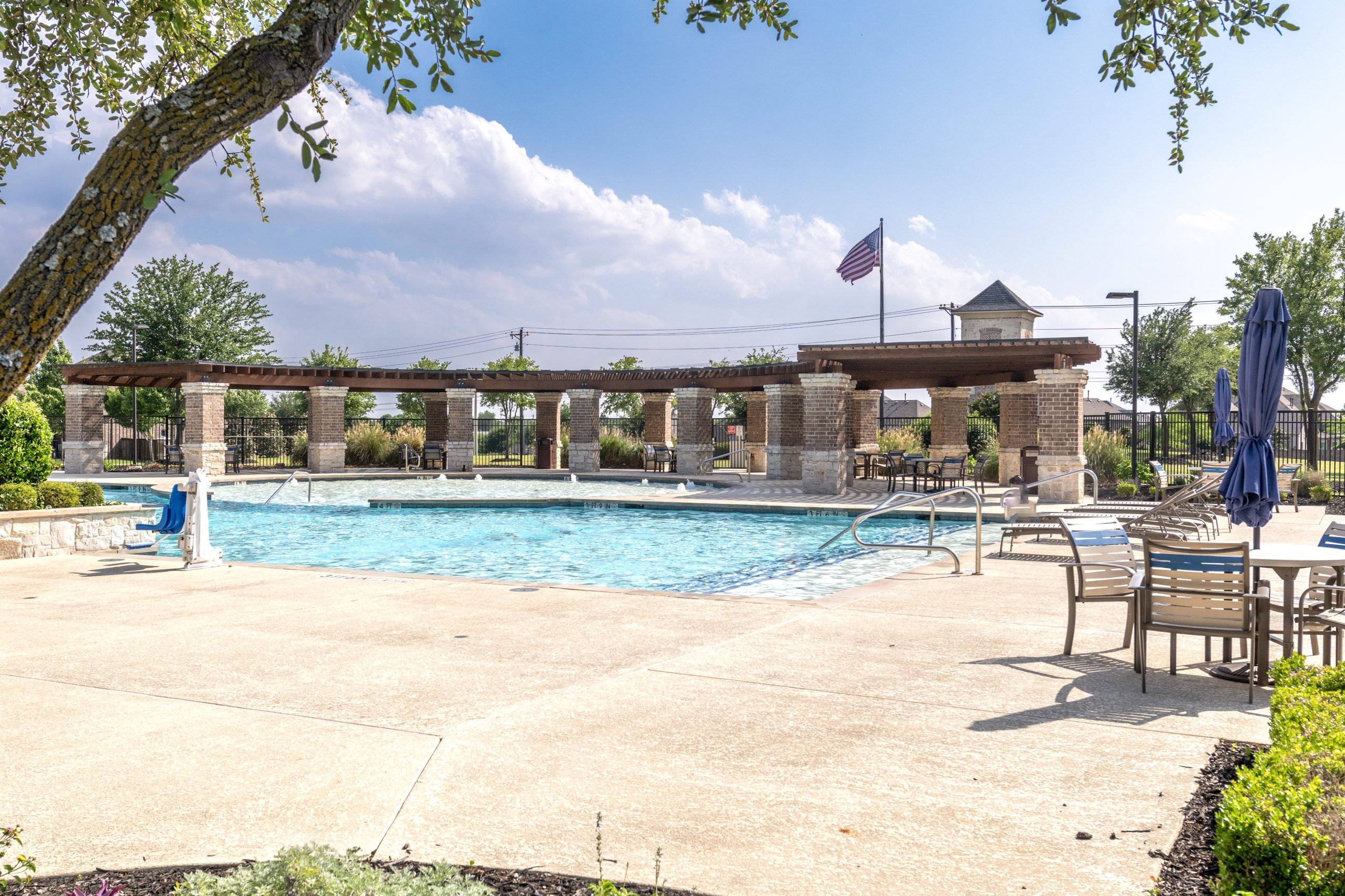 - Outdoor pool area with wooden pergola, lounge chairs, and greenery.